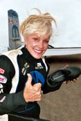 Thumbs Up: Aerobatic performer and retired airline pilot, Julie Clark holds one of her shoes and gives a "thumbs up" for her ShockBlockers® Insole Inserts. Julie says, "ShockBlockers Insole inserts are in my shoes, always."